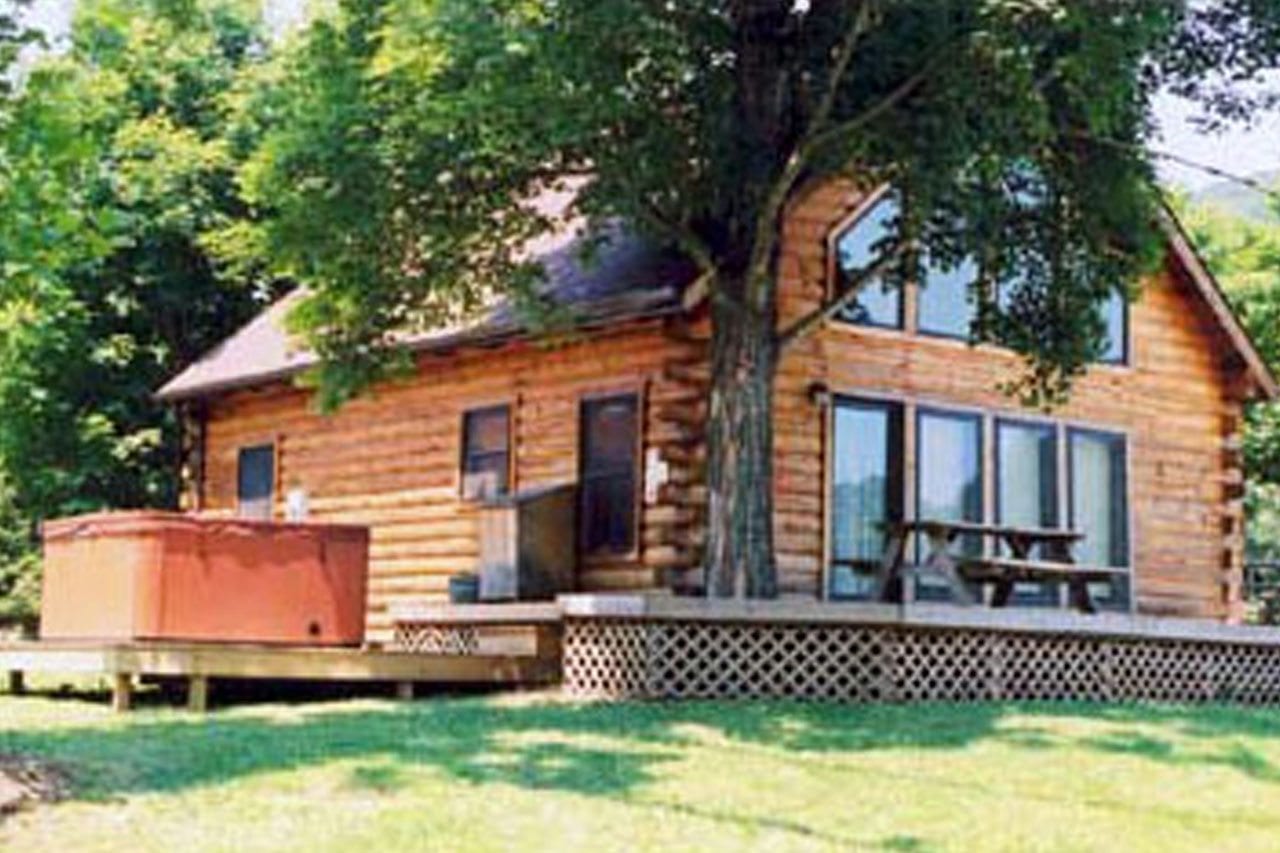 Riverfront Log Cabin has three bedrooms, two baths, kitchen, great room with a rock fireplace and private outdoor Hot Tub and private firepit. The spacious loft contains the master bedroom, jacuzzi and bathroom. The two bedrooms downstairs share a bathroom.